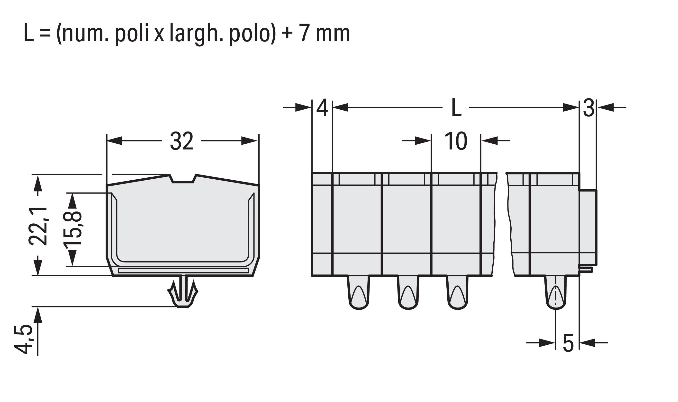 Morsettiera per 4 conduttori. senza pulsanti. adatto per applicazioni Ex e II. con piedi di fissaggio a scatto. 5 poli. per spessore della piastra di 0,6 x 1,2 mm. Foro di fissaggio Ø 3,5 mm. 2,5 mm2. CAGE CLAMP®. 2,50 mm2. grigio chiaro