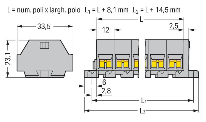 Morsettiera per 4 conduttori. senza pulsanti. con flange di fissaggio. 12 poli. per versioni di montaggio a vite o similari. Foro di fissaggio Ø 3,2 mm. 4 mm2. CAGE CLAMP®. 4,00 mm2. grigio
