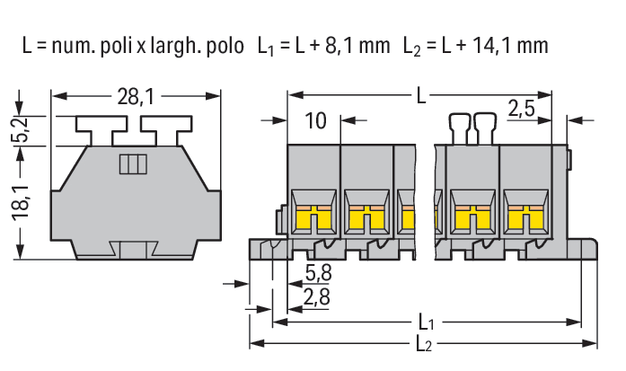 Morsettiera per 4 conduttori. su entrambi i lati con pulsanti. con flange di fissaggio. 4 poli. per versioni di montaggio a vite o similari. Foro di fissaggio Ø 3,2 mm. 2,5 mm2. CAGE CLAMP®. 2,50 mm2. grigio