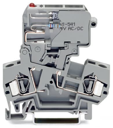 Morsetto con fusibile per 2 conduttori. con portafusibile pivotante. per fusibile miniaturizzato 5 x 20 mm. con indicazione di fusibile guasto con LED. 30 - 65 V. per guida DIN 35 x 15 e 35 x 7,5. 4 mm2. CAGE CLAMP®. 4,00 mm2. grigio