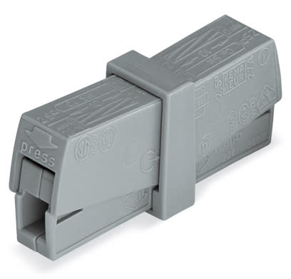 Morsetto di servizio. pulsanti su ambo i lati. Lato lampada: per tutti i tipi di conduttore. Lato installazione: per conduttori rigidi. Serie 224. max. 2,5 mm2. temperatura operativa ambiente max 60 °C. 2,50 mm2. grigio
