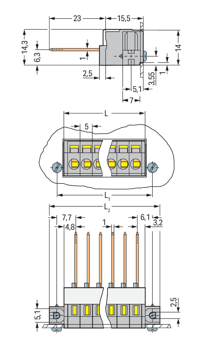 Morsetto passaparete. Connessione wire-wrap/conduttore. Spessore piastra: 1,5 mm. 2,5 mm2. Passo pin 5 mm. 6 poli. CAGE CLAMP®. 2,50 mm2. grigio