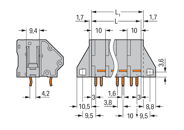 Morsetto per circuito stampato. 16 mm2. Passo pin 10 mm. 4 poli. CAGE CLAMP®. collegamento a ponte opzionale. 16,00 mm2. grigio