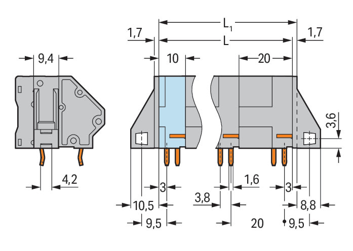Morsetto per circuito stampato. 16 mm2. Passo pin 20 mm. 3 poli. CAGE CLAMP®. collegamento a ponte opzionale. 16,00 mm2. grigio