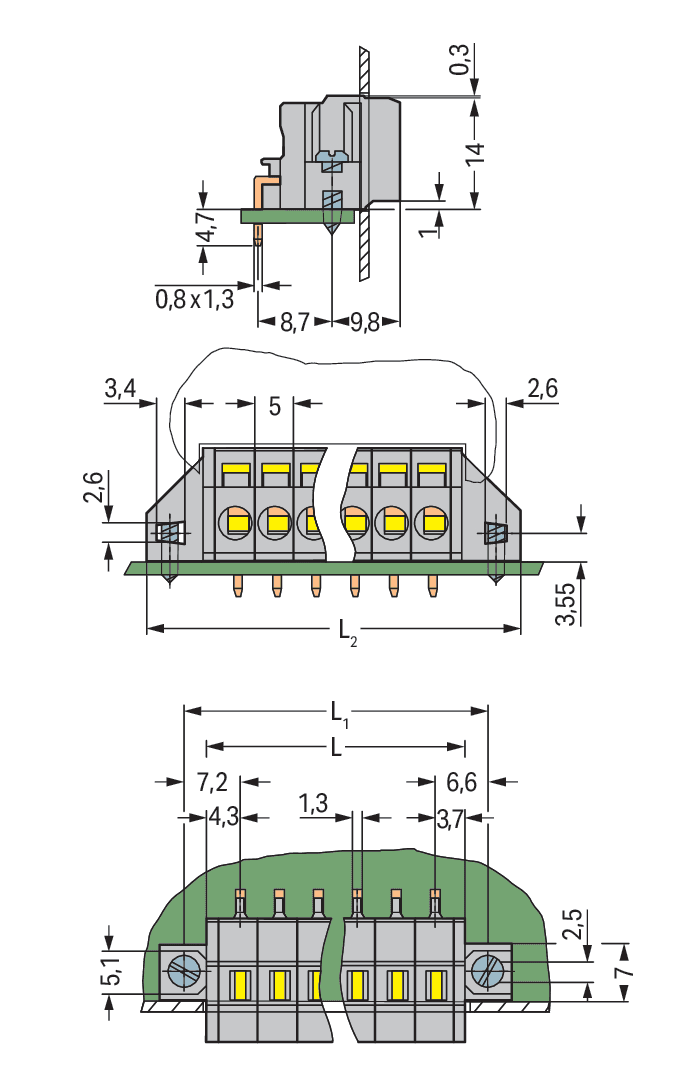 Morsetto per circuito stampato. 2,5 mm2. Passo pin 5 mm. 9 poli. CAGE CLAMP®. collare di fissaggio. 2,50 mm2. grigio
