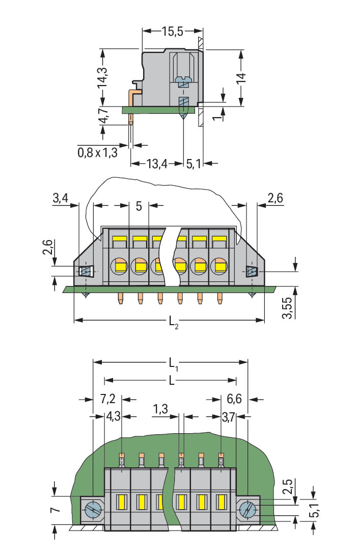 Morsetto per circuito stampato. 2,5 mm2. Passo pin 5 mm. 6 poli. CAGE CLAMP®. collare di fissaggio. 2,50 mm2. grigio