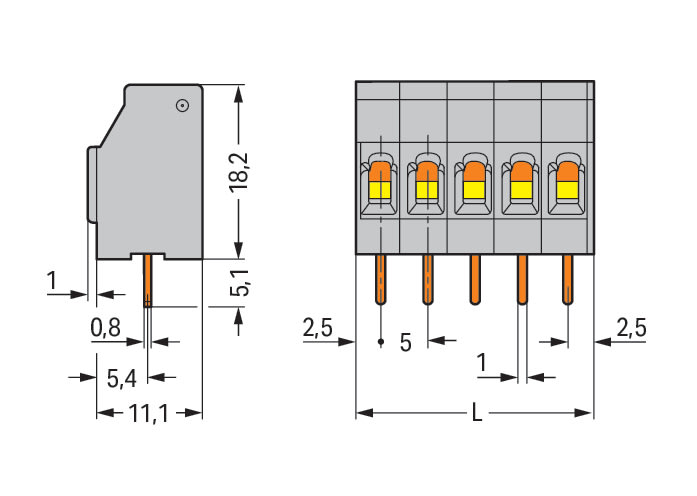 Morsetto per circuito stampato. 2,5 mm2. Passo pin 5 mm. 5 poli. CAGE CLAMP®. 2,50 mm2. grigio chiaro