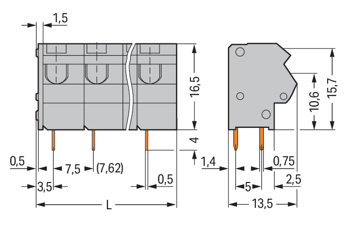 Morsetto per circuito stampato. 2,5 mm2. Passo pin 7,5/7,62 mm. 2 poli. PUSH WIRE®. 2,50 mm2. grigio