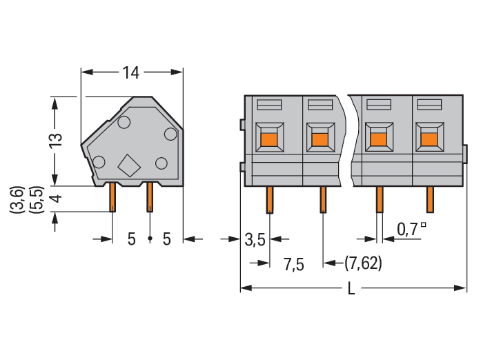 WAGO ELETTRONICA - Morsetto per circuito stampato.2,5 mm².Passo pin 7,5/7,62 mm.grigio 236-504/332-000