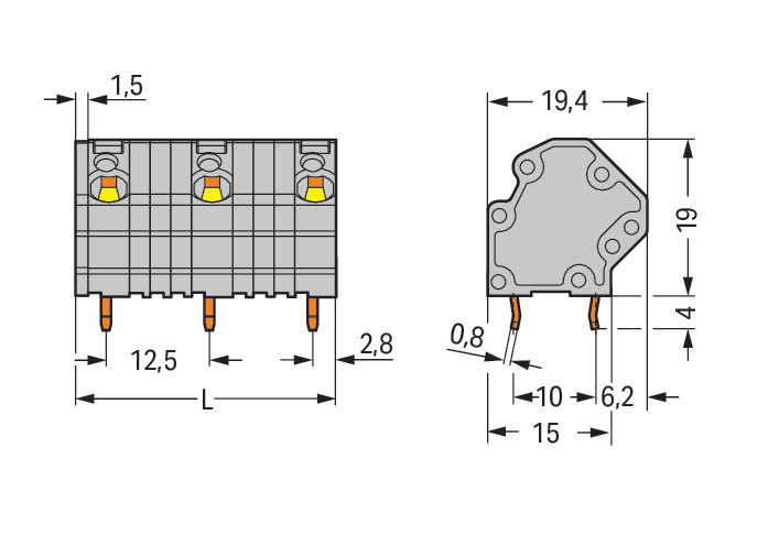 Morsetto per circuito stampato. 4 mm2. Passo pin 12,5 mm. 2 poli. CAGE CLAMP®. 4,00 mm2. grigio