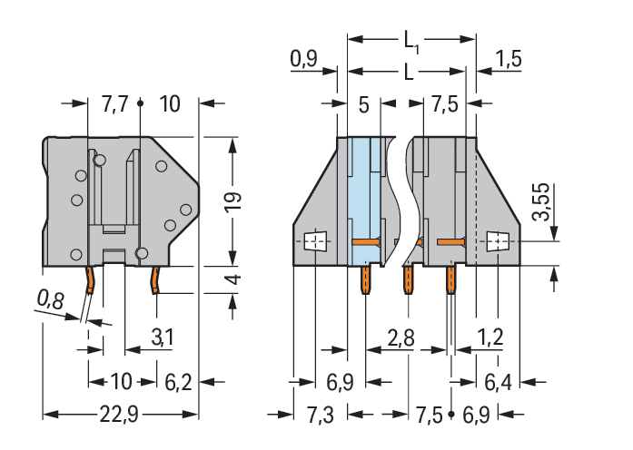 Morsetto per circuito stampato. 4 mm2. Passo pin 7,5 mm. 2 poli. CAGE CLAMP®. collegamento a ponte opzionale. 4,00 mm2. grigio