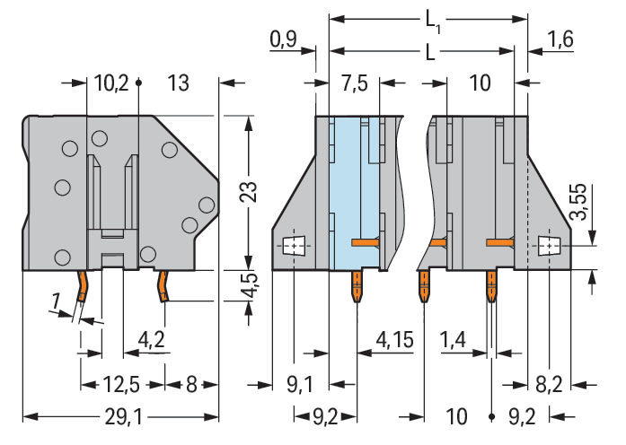 Morsetto per circuito stampato. 6 mm2. Passo pin 10 mm. 3 poli. adatto per applicazioni Ex-i. CAGE CLAMP®. collegamento a ponte opzionale. 6,00 mm2. blu