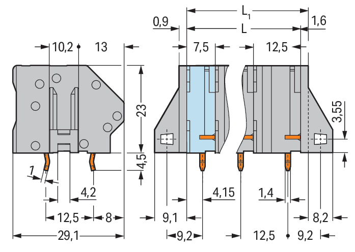 Morsetto per circuito stampato. 6 mm2. Passo pin 12,5 mm. 9 poli. CAGE CLAMP®. collegamento a ponte opzionale. 6,00 mm2. grigio