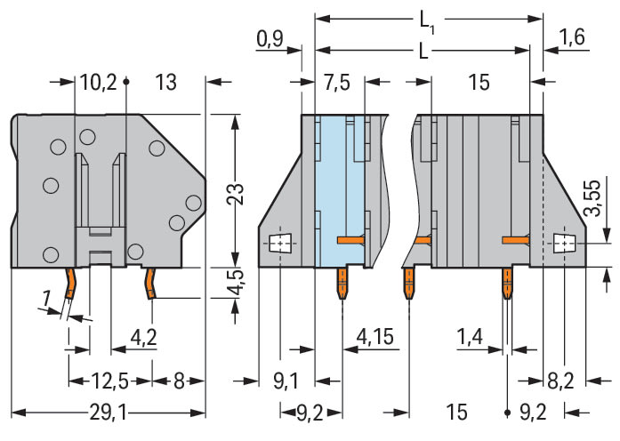 Morsetto per circuito stampato. 6 mm2. Passo pin 15 mm. 3 poli. CAGE CLAMP®. collegamento a ponte opzionale. 6,00 mm2. grigio