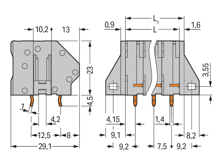 Morsetto per circuito stampato. 6 mm2. Passo pin 7,5 mm. 3 poli. CAGE CLAMP®. collegamento a ponte opzionale. 6,00 mm2. grigio