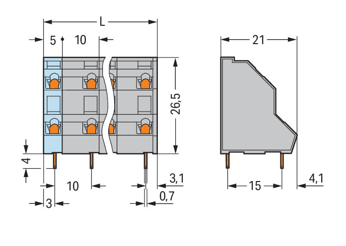 Morsetto per circuito stampato a due piani. 2,5 mm2. Passo pin 10 mm. 16 poli. CAGE CLAMP®. 2,50 mm2. grigio