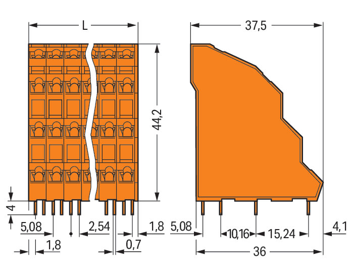 WAGO ELETTRONICA - Morsetto per circuito stampato a quattro piani.2,5 mm².Passo pin 5,08 mm.arancione 738-416