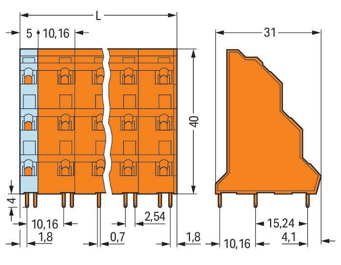 WAGO ELETTRONICA - Morsetto per circuito stampato a tre piani.2,5 mm².Passo pin 10,16 mm.arancione