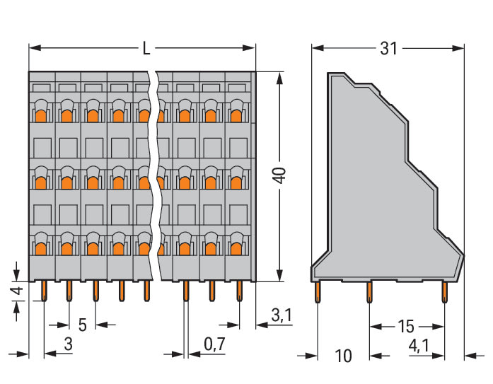WAGO ELETTRONICA - Morsetto per circuito stampato a tre piani.2,5 mm².Passo pin 5 mm.grigio 737-102