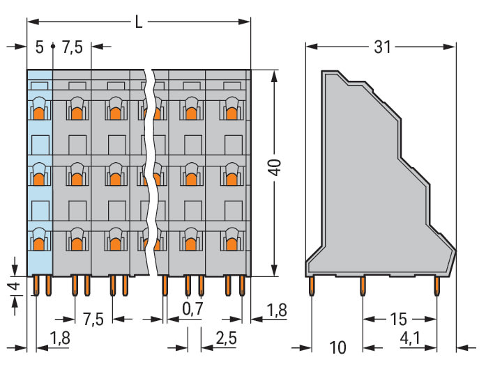 WAGO ELETTRONICA - Morsetto per circuito stampato a tre piani.2,5 mm².Passo pin 7,5 mm.grigio 737-558
