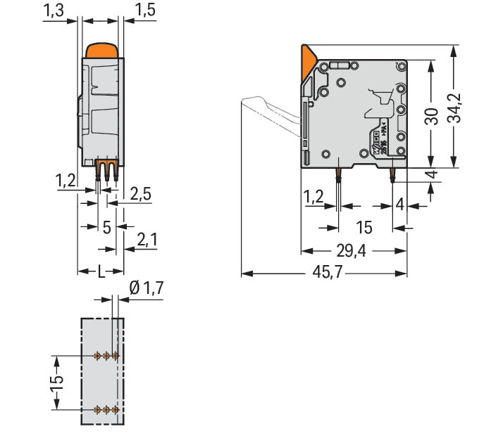 Morsetto per circuito stampato. leva. 16 mm2. Passo pin 10 mm. 1 polo. Push-in CAGE CLAMP®. 16,00 mm2. grigio