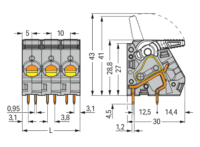Morsetto per circuito stampato. leva. 16 mm2. Passo pin 10 mm. 5 poli. CAGE CLAMP®. 16,00 mm2. grigio