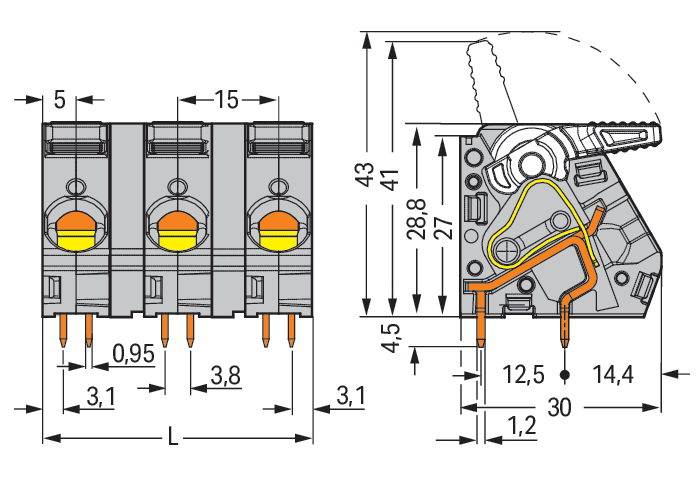 Morsetto per circuito stampato. leva. 16 mm2. Passo pin 15 mm. 3 poli. CAGE CLAMP®. 16,00 mm2. rosso
