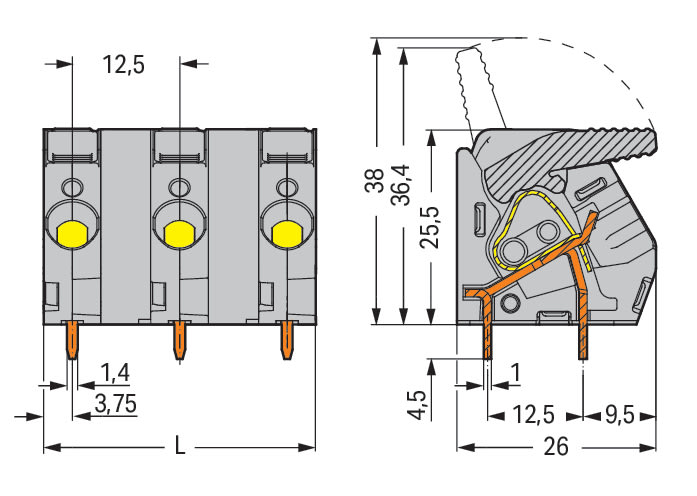 Morsetto per circuito stampato. leva. 6 mm2. Passo pin 12,5 mm. 4 poli. CAGE CLAMP®. 6,00 mm2. grigio chiaro