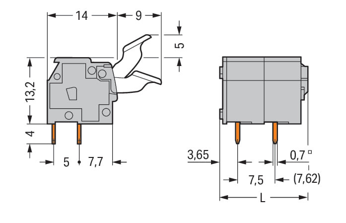 Morsetto per circuito stampato. leve azionate a mano. 2,5 mm2. Passo pin 7,5/7,62 mm. 2 poli. CAGE CLAMP®. collegamento a ponte opzionale. 2,50 mm2. grigio