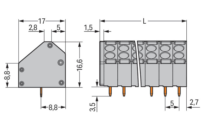Morsetto per circuito stampato per 2 conduttori. 1,5 mm2. Passo pin 5 mm. 9 poli. Push-in CAGE CLAMP®. 1,50 mm2. grigio