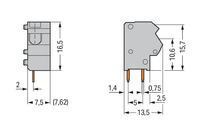 Morsetto per circuito stampato per 2 conduttori sovrapponibile. 0,75 mm2. Passo pin 7,5/7,62 mm. 1 polo. PUSH WIRE®. 0,75 mm2. verde chiaro