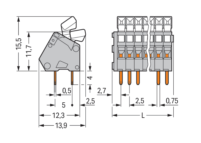 Morsetto per circuito stampato. pulsante. 0,5 mm2. Passo pin 2,5 mm. 16 poli. CAGE CLAMP®. 0,50 mm2. grigio