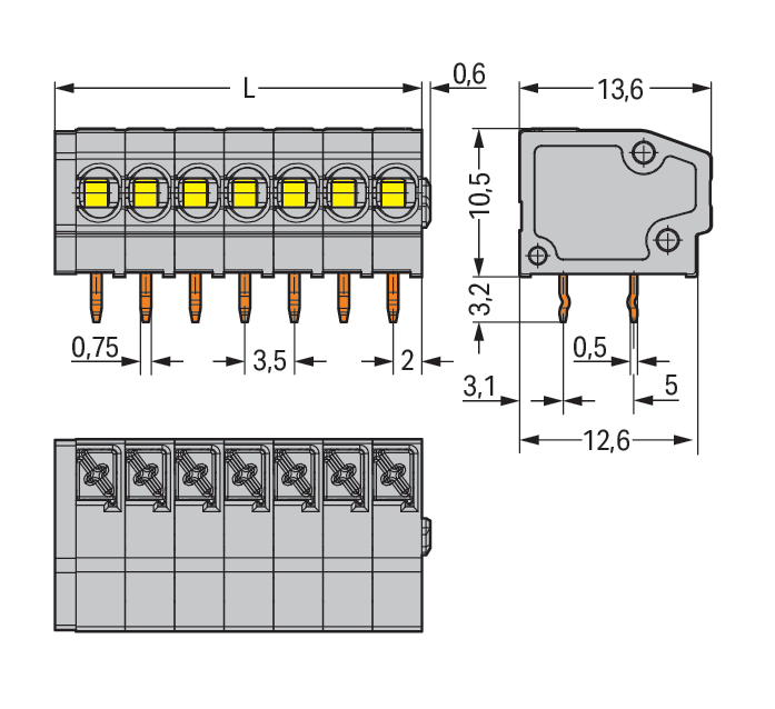 Morsetto per circuito stampato. pulsante. 1,5 mm2. Passo pin 3,5 mm. 7 poli. Push-in CAGE CLAMP®. 1,50 mm2. grigio