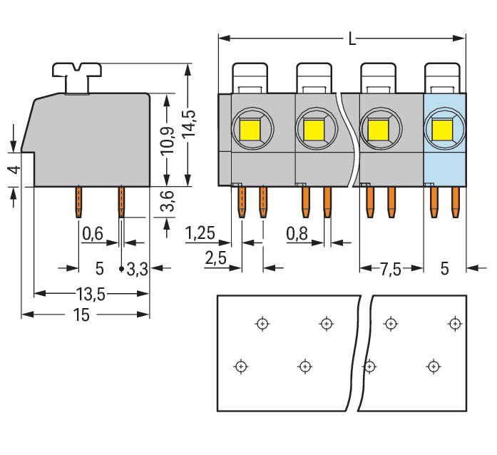 Morsetto per circuito stampato. pulsante. 2,5 mm2. Passo pin 7,5 mm. 4 poli. Push-in CAGE CLAMP®. 2,50 mm2. arancione
