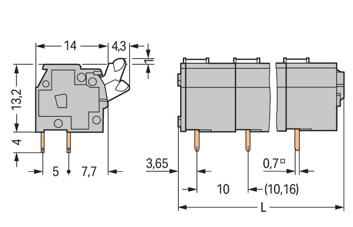 Morsetto per circuito stampato. pulsante. 2,5 mm2. Passo pin 10/10,16 mm. 5 poli. CAGE CLAMP®. collegamento a ponte opzionale. 2,50 mm2. grigio