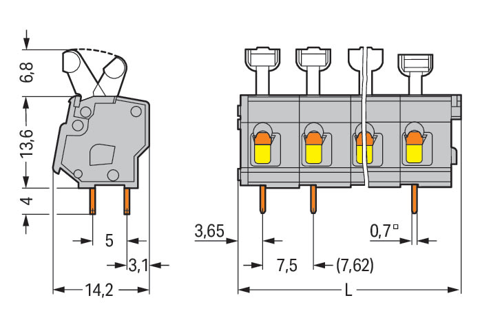 Morsetto per circuito stampato. pulsante. 2,5 mm2. Passo pin 7,5/7,62 mm. 12 poli. CAGE CLAMP®. collegamento a ponte opzionale. 2,50 mm2. grigio