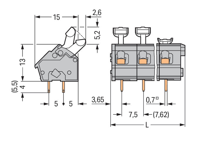 Morsetto per circuito stampato. pulsante. 2,5 mm2. Passo pin 7,5/7,62 mm. 7 poli. CAGE CLAMP®. collegamento a ponte opzionale. 2,50 mm2. grigio