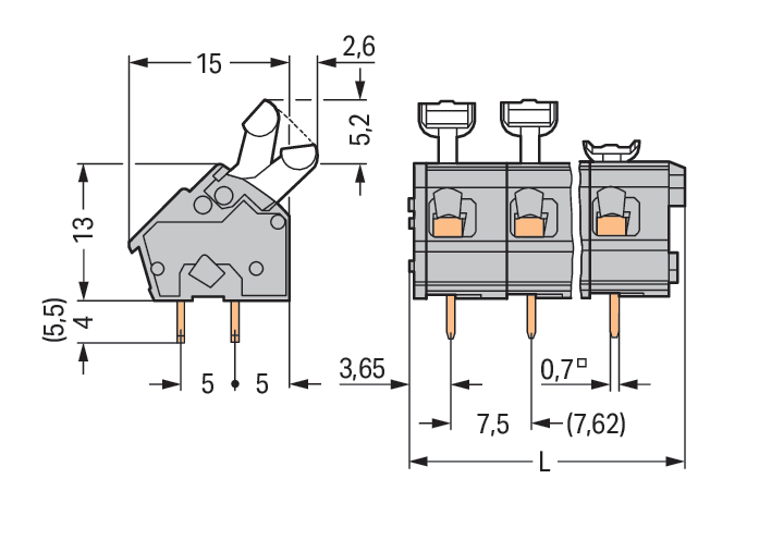 Morsetto per circuito stampato. pulsante. 2,5 mm2. Passo pin 7,5/7,62 mm. 16 poli. CAGE CLAMP®. collegamento a ponte opzionale. 2,50 mm2. grigio