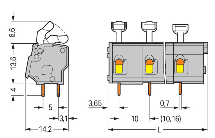Morsetto per circuito stampato. pulsante. 2,5 mm2. Passo pin 10/10,16 mm. 12 poli. CAGE CLAMP®. collegamento a ponte opzionale. 2,50 mm2. grigio