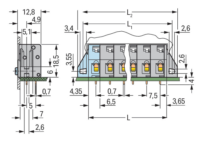 Morsetto per circuito stampato. pulsante. 2,5 mm2. Passo pin 7,5 mm. 5 poli. CAGE CLAMP®. collare di fissaggio. 2,50 mm2. grigio