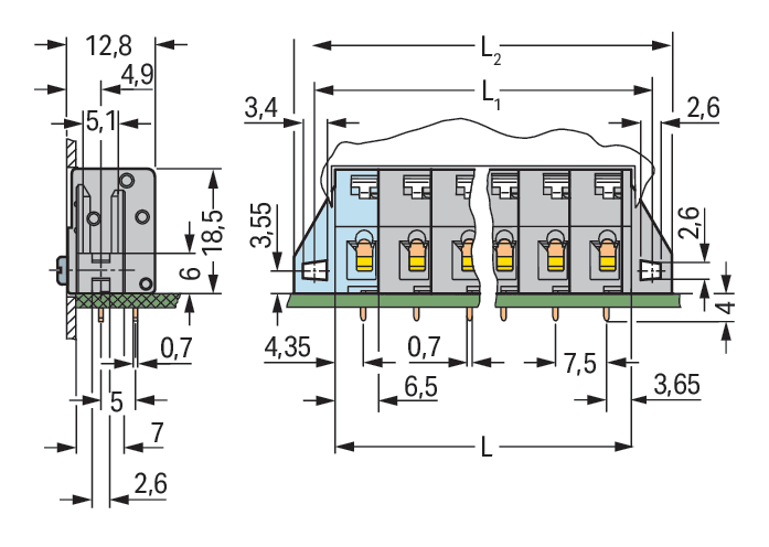 Morsetto per circuito stampato. pulsante. 2,5 mm2. Passo pin 7,5 mm. 6 poli. CAGE CLAMP®. collare di fissaggio. 2,50 mm2. grigio