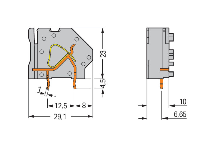 Morsetto per circuito stampato sovrapponibile. 6 mm2. Passo pin 10 mm. 1 polo. CAGE CLAMP®. collegamento a ponte opzionale. 6,00 mm2. grigio