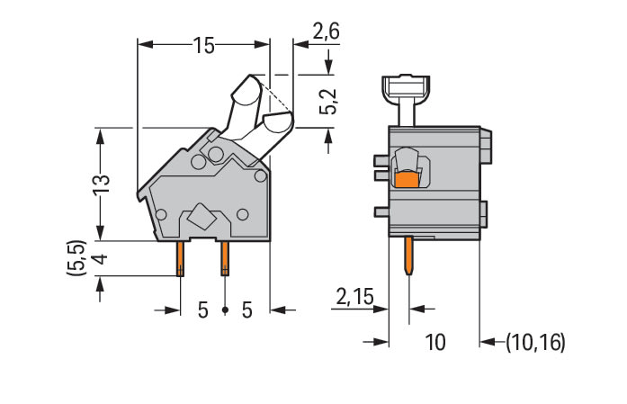 Morsetto per circuito stampato sovrapponibile. pulsante. 2,5 mm2. Passo pin 10/10,16 mm. 1 polo. CAGE CLAMP®. collegamento a ponte opzionale. 2,50 mm2. grigio chiaro