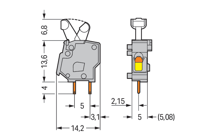 Morsetto per circuito stampato sovrapponibile. pulsante. 2,5 mm2. Passo pin 5/5,08 mm. 1 polo. CAGE CLAMP®. collegamento a ponte opzionale. 2,50 mm2. grigio scuro