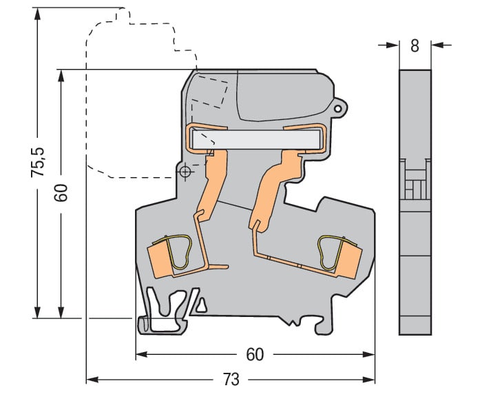 Morsetto sezionatore per 2 conduttori. per guida DIN 35 x 15 e 35 x 7,5. 4 mm2. CAGE CLAMP®. 4,00 mm2. grigio