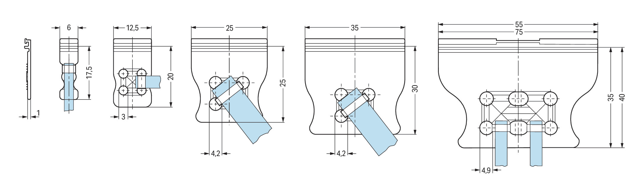 Piastrina antistrappo. per connettori maschio e femmina. larghezza 6 mm. monopezzo. Passo pin 3,5 mm. grigio chiaro