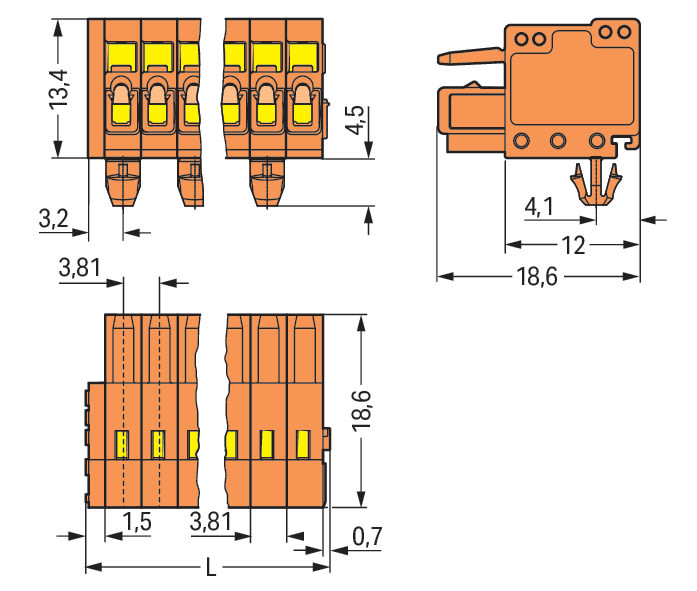 Spina femmina per 1 conduttore. CAGE CLAMP®. 1,5 mm2. Passo pin 3,81 mm. 16 poli. Protetto al 100% contro l'inversione di polarità. Piedi di fissaggio a scatto. 1,50 mm2. arancione