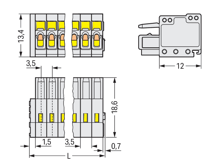 Spina femmina per 1 conduttore. CAGE CLAMP®. 1,5 mm2. Passo pin 3,5 mm. 14 poli. Protetto al 100% contro l'inversione di polarità. 1,50 mm2. grigio chiaro