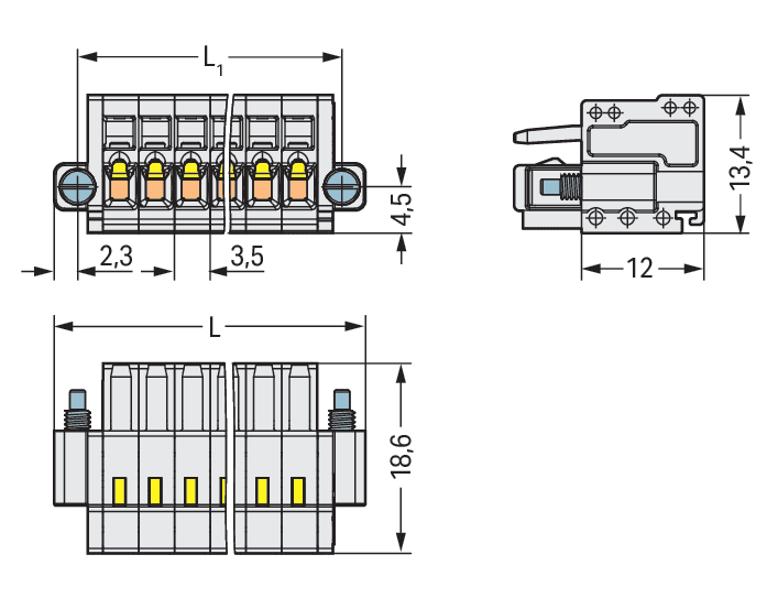 Spina femmina per 1 conduttore. CAGE CLAMP®. 1,5 mm2. Passo pin 3,5 mm. 24 poli. Protetto al 100% contro l'inversione di polarità. Flangia a vite. 1,50 mm2. grigio chiaro