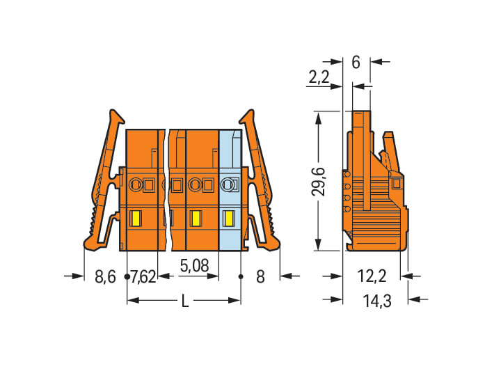 Spina femmina per 1 conduttore. CAGE CLAMP®. 2,5 mm2. Passo pin 7,62 mm. 6 poli. Leve di bloccaggio laterali. 2,50 mm2. arancione